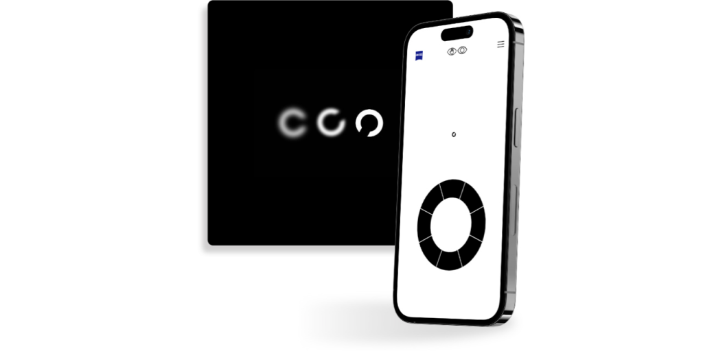 Simula a verificação do desempenho visual no ecrã. Este teste não substitui os exames realizados por um especialista. Serve para dar uma ideia geral da sua qualidade visual. Inclui simulação de refracção subjectiva e avaliação binocular.